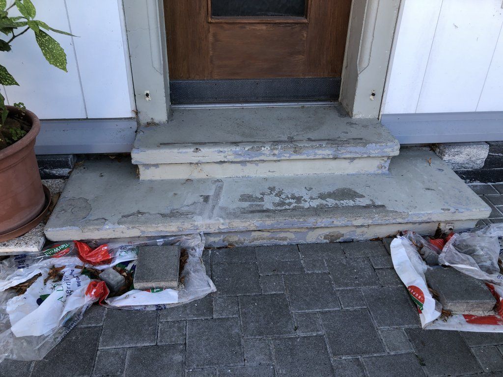 nachher Flüssigkunststoff mit Anti-Rutsch-Beschichtung und Chips schwarz Haussockel und Podest neuer Sockelputz aufgezogen und abgefilzt.